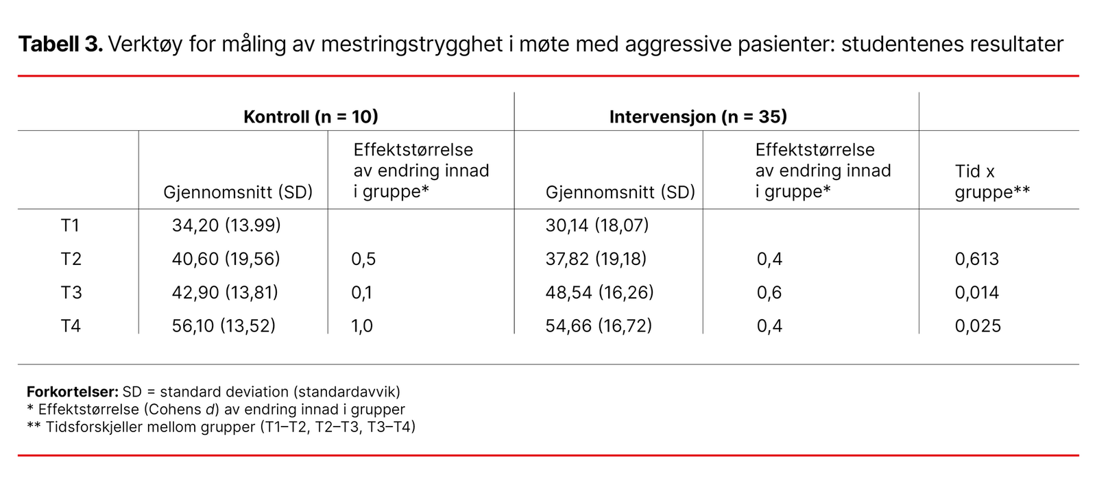 For begge gruppene ble det observert forbedring av det sekundære utfallsmålet – sykepleierstudentenes mestringstrygghet i møte med aggressive pasienter – etter hvert simuleringsscenario, men den mest betydelige forbedringen fant sted etter opplæringen i deeskalering (tabell 3).