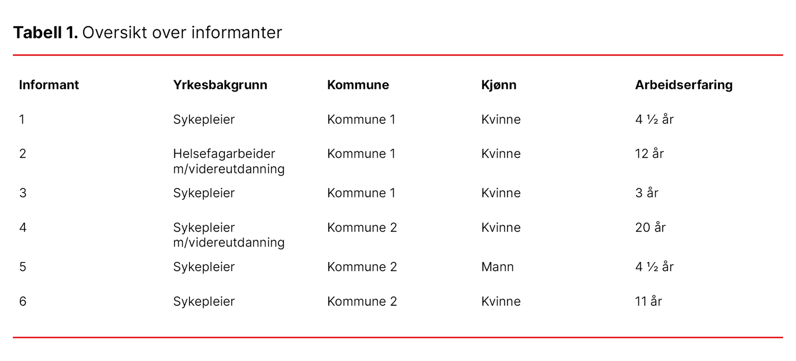 Inklusjonskriterier var helsefaglig utdanning, minimum fagbrev og/eller treårig høyskoleutdanning, minimum 50 prosent stilling og mer enn ett års erfaring fra hjemmetjenesten. Kriteriene bidro til at vi rekrutterte informanter med relevant erfaring og kunnskap. Fire av informantene var sykepleiere og en var helsefagarbeider. Det var fem kvinner og en mann i alderen 27–59 år (gjennomsnittsalder 40,5 år). De hadde 3–20 års arbeidserfaring fra hjemmetjenesten (tabell 1).
