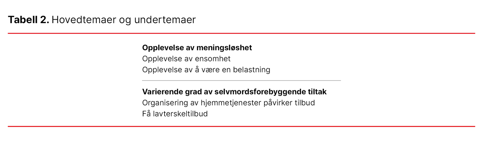 Analysen av intervjuene viste to hovedtemaer relatert til hvordan helsepersonell i hjemmetjenesten erfarte selvmordsrisikoen til hjemmeboende eldre, og hvilke tiltak som iverksettes. Hovedtemaene er «Opplevelse av meningsløshet» og «Varierende grad av selvmordsforebyggende tiltak». Begge har to undertemaer (tabell 2).