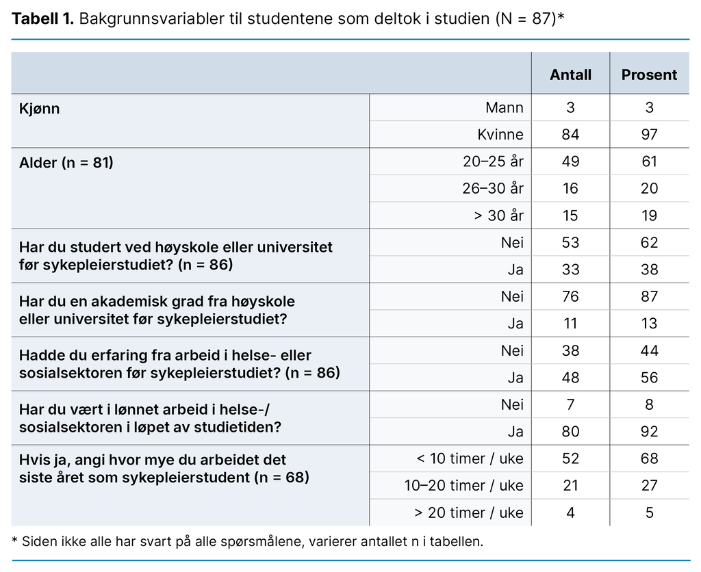 De fleste studentene som deltok i studien, var kvinner (97 prosent) mellom 20 og 25 år (61 prosent) som hadde erfaring med arbeid i helse- og sosialsektoren før de startet på utdanningen (56 prosent). Dessuten arbeidet majoriteten av studentene (92 prosent) i helse- og sosialsektoren under studietiden, hovedsakelig mindre enn ti timer i uken (tabell 1).