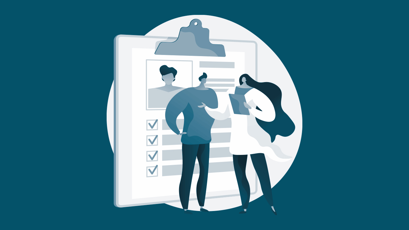 Illustrasjonen viser en ung mann og en ung dame som står. Bak dem ses et stort skjema med en klips på og avkrysningsbokser