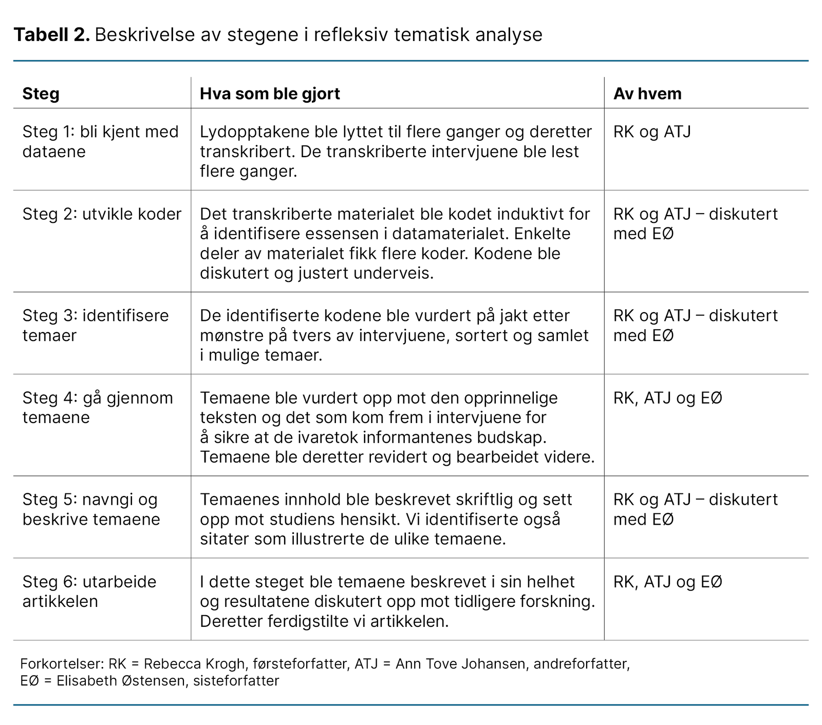 Vi analyserte datamaterialet ved å bruke refleksiv tematisk analyse som beskrevet av Braun og Clarke (21). Refleksiv tematisk analyse innebærer at forskeren anerkjenner sin egen forforståelse og reflekterer underveis over hvordan egne erfaringer kan påvirke analysen (21). Analysemetoden består av seks steg. Tabell 2 viser hva vi gjorde for hvert steg, og hvem av forfatterne som var involvert.