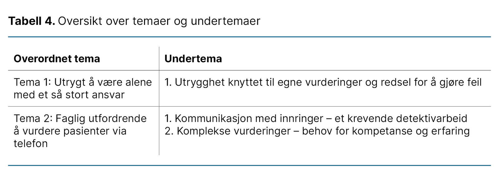 I analyseprosessen identifiserte vi to overordnede temaer som beskrev sykepleiernes opplevelse av å gjøre vurderinger på legevaktsentralen (tabell 4). Temaene utdypes videre i dette kapittelet.