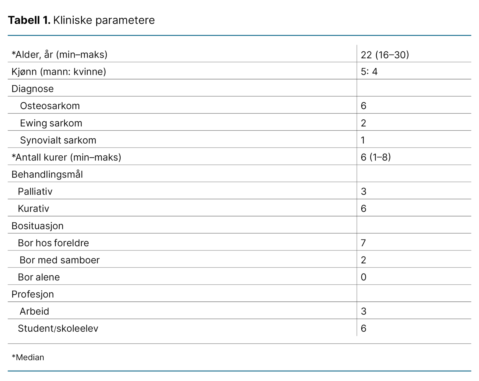Inklusjonskriteriene var at informantene måtte ha diagnosen sarkom, ha gjennomført minst én behandling hjemme og være mellom 16 og 30 år. Pasientene ble rekruttert ved poliklinikk og sengepost på et universitetssykehus i Norge. Alle pasientene som oppfylte inklusjonskriteriene, fikk utlevert et informasjonsskriv med forespørsel om å delta. Elleve ble forespurt, der to takket nei. Ni pasienter ble dermed inkludert (tabell 1).