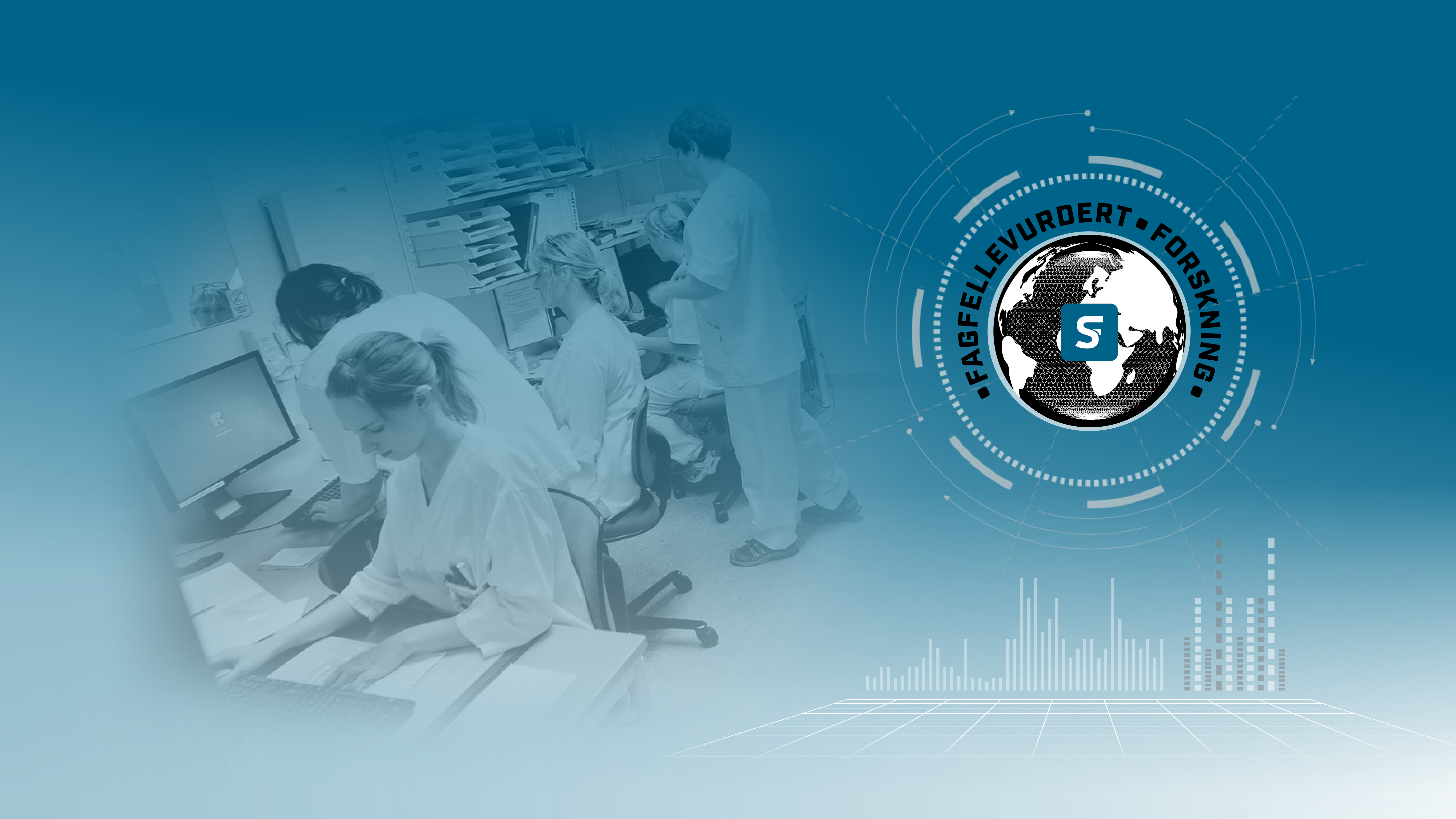Illustrasjonen viser noen sykepleiere som sitter og jobber på et kontor. En jordklode synes til høyre i bildet, med teksten "Fagfellevurdert forskningsartikkel" rundt. Under ses søyler og grafer
