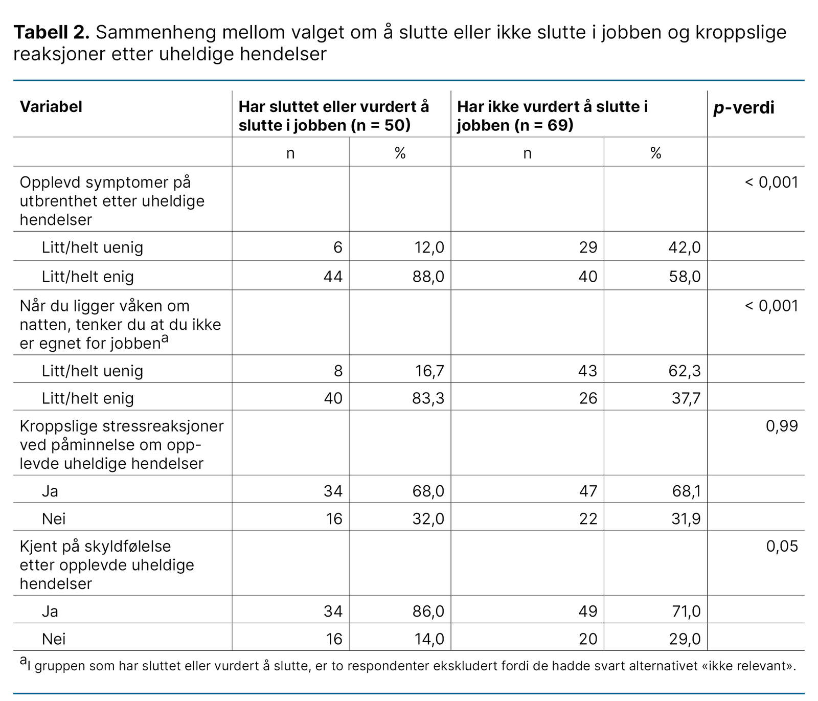 I tabell 2 presenterer vi kroppslige reaksjoner til de som hadde sluttet eller vurderte å slutte sammenliknet med de som ikke vurderte å slutte. Gruppen jordmødre som hadde sluttet eller vurderte å slutte i jobben, opplevde i større grad symptomer på utbrenthet (p-verdi < 0,001) og hadde oftere tanker om at de ikke var egnet i jobben (p-verdi < 0,001) sammenliknet med gruppen som ikke vurderte å slutte.