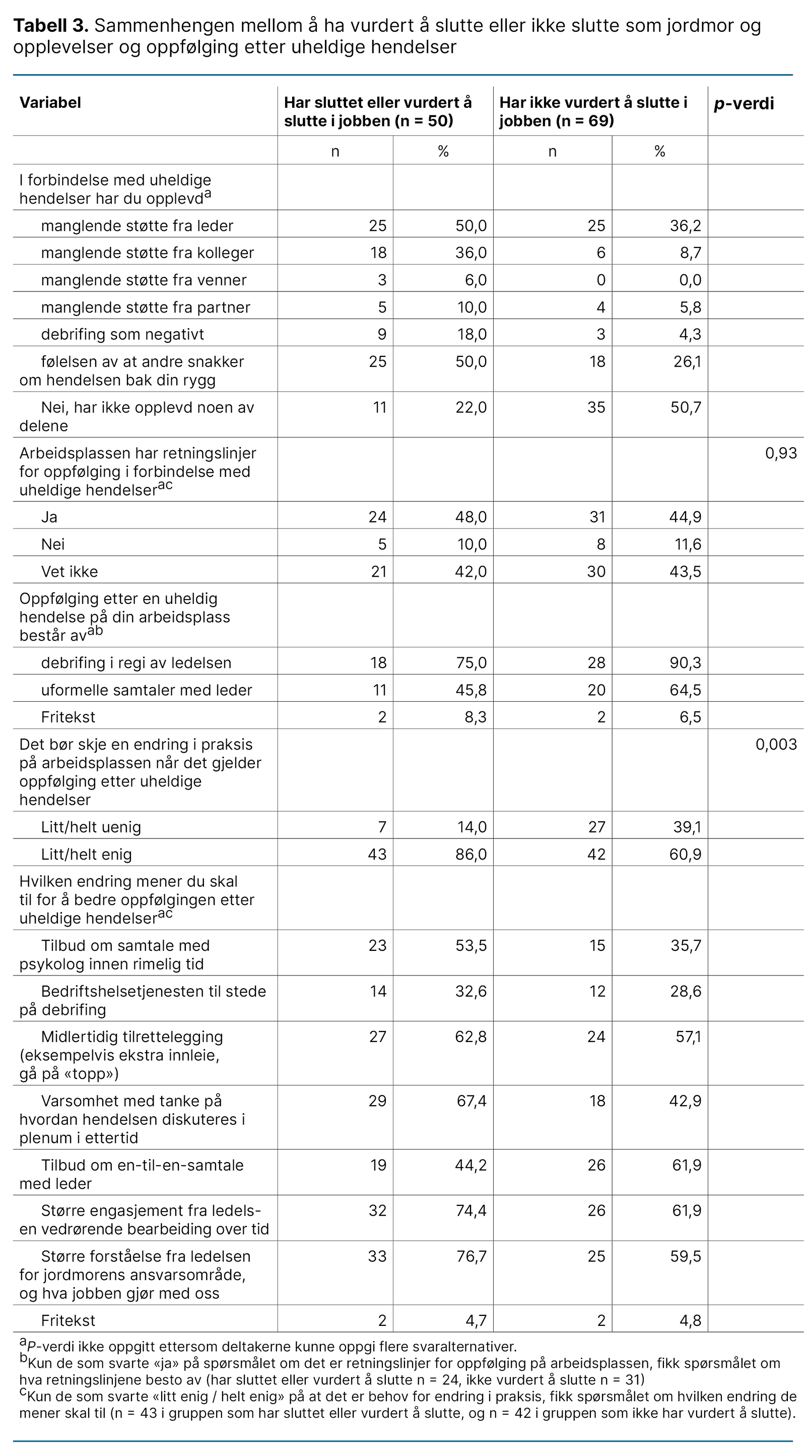I gruppen som hadde sluttet eller vurderte å slutte, var det flere som var litt eller helt enig (p-verdi 0,003) i at det bør skje en endring i oppfølgingen etter uheldige hendelser på arbeidsplassen, sammenliknet med de som ikke vurderte å slutte.