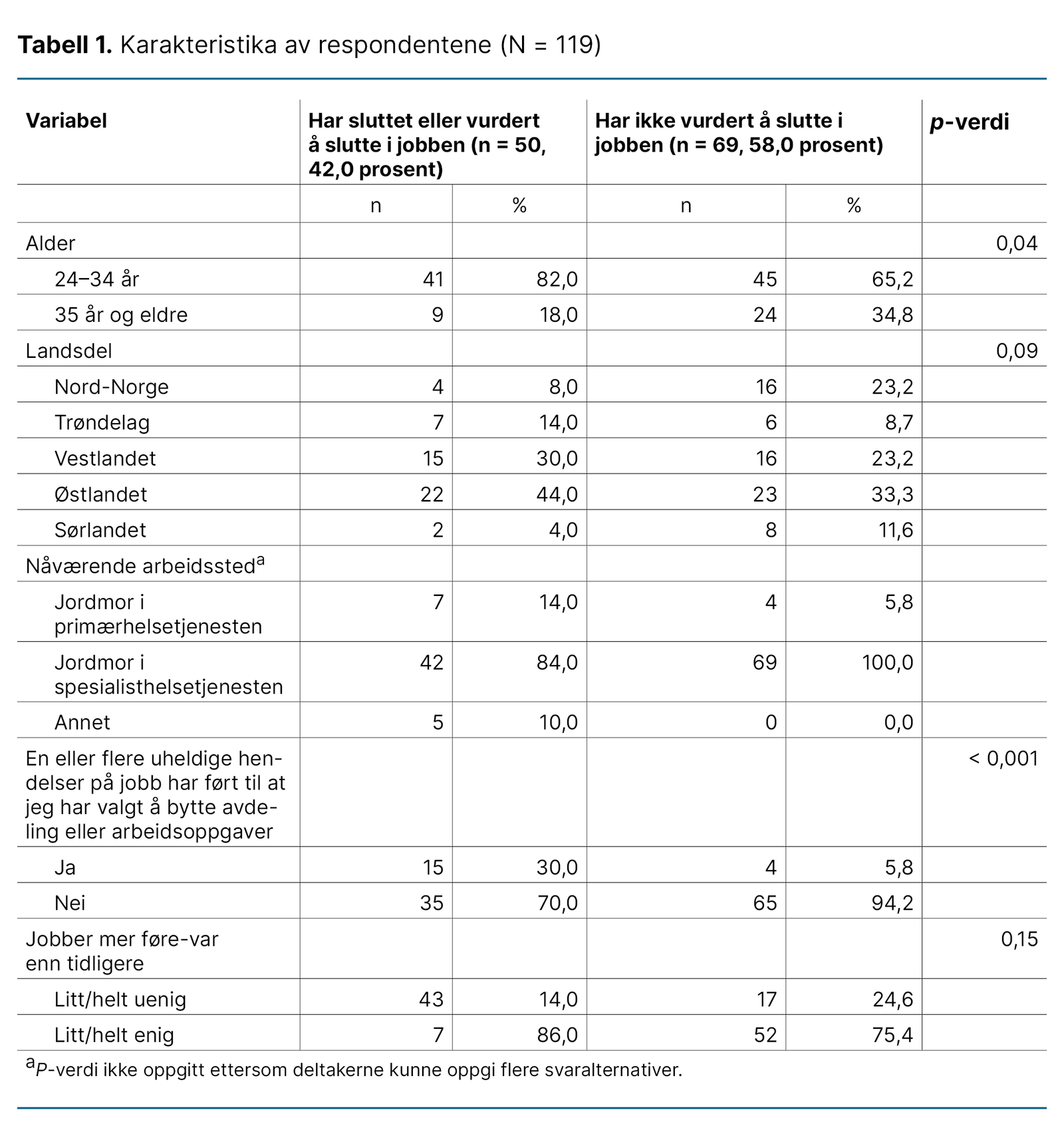 Tabell 1 viser respondentenes karakteristika. Av de 119 nyutdannede jordmødrene som ble inkludert i studien, oppga 42,0 prosent at de hadde sluttet (n = 3) eller vurderte å slutte (n = 47) i jobben som jordmor.
