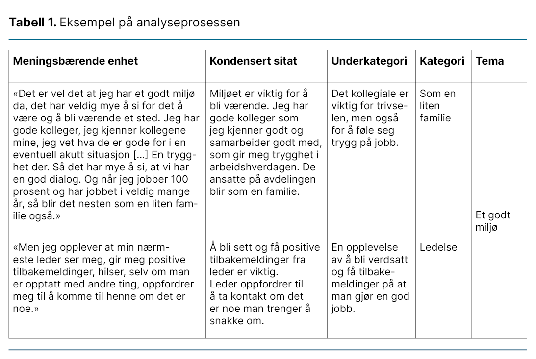 Resultat: Analysen resulterte i seks kategorier, som ble fordelt på tre overordnede temaer: 1) «Mening og variasjon» beskrev intensivsykepleiernes motivasjon i arbeidshverdagen og innebærer at arbeidsdagene aldri er like, samt opplevelsen av yrkesstolthet, 2) «Et godt miljø» beskrev viktigheten av gode relasjoner med kolleger og lederen for å trives på jobb, og 3) «Faglig engasjement» beskrev behov og muligheter for kontinuerlig utvikling samt betydningen av opparbeidet erfaring.