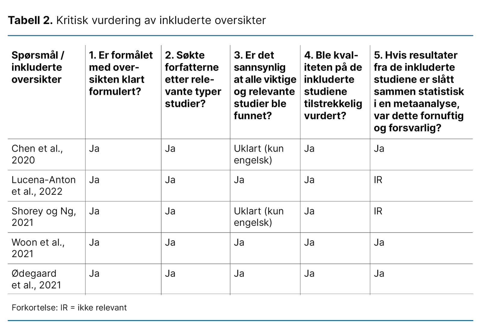 Den inneholder totalt ti spørsmål, men vi anvendte kun de seks første, som omhandler den interne validiteten til oversiktene (del A). Vi vurderte ikke de fire siste spørsmålene (del B og C), som omhandler resultatene og den eksterne validiteten til oversikten. Spørsmålene ble vurdert til «ja», «nei» eller «uklart» (vedlegg 2).