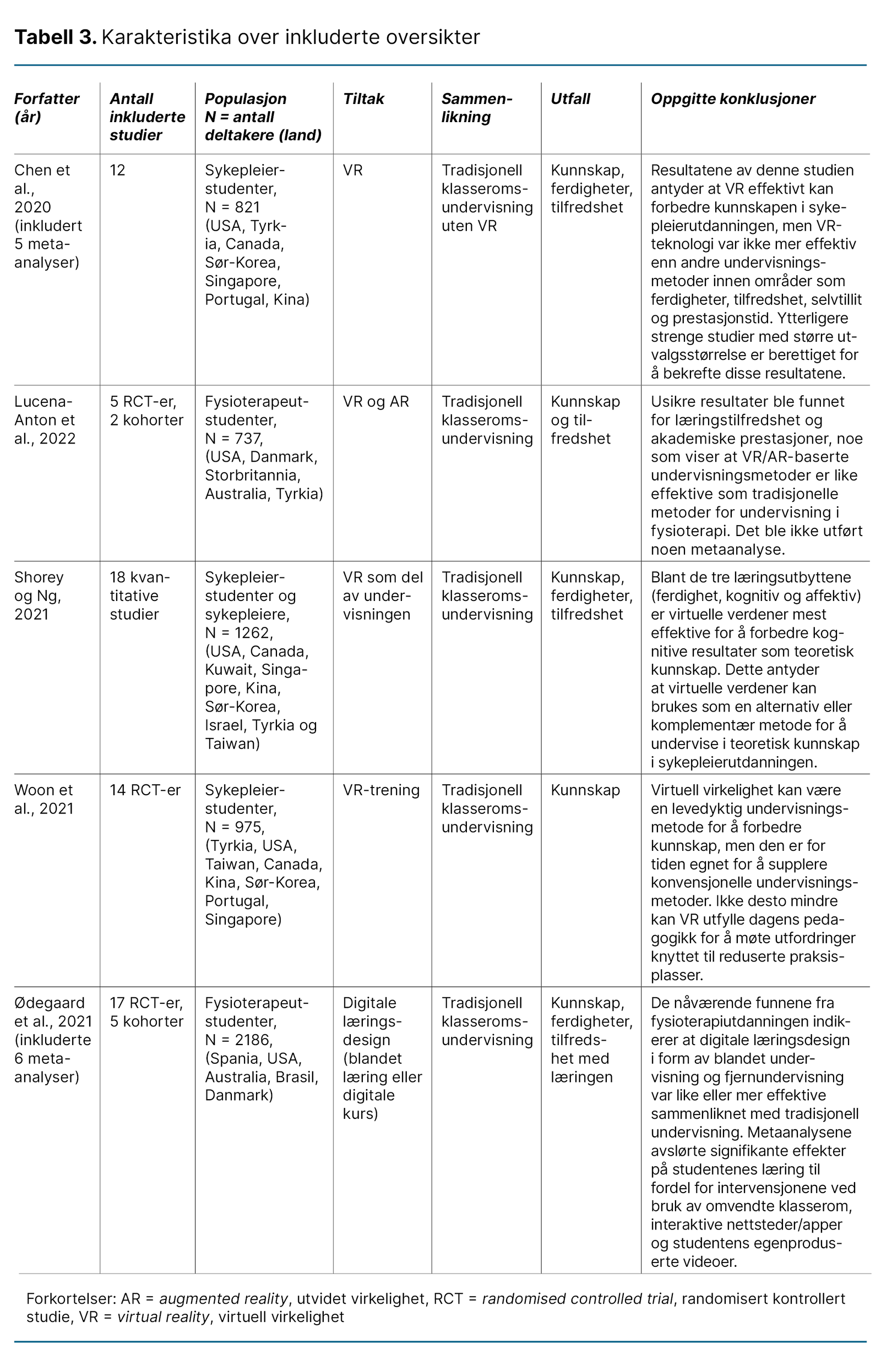 Tre oversikter inkluderte sykepleierstudenter (26, 27, 29), og to oversikter inkluderte fysioterapeutstudenter (23, 28). En oversikt omhandlet effekten av ulike typer blandet undervisning (23), og fire oversikter oppsummerte effekten av VR-teknologi (26–29) (tabell 3).