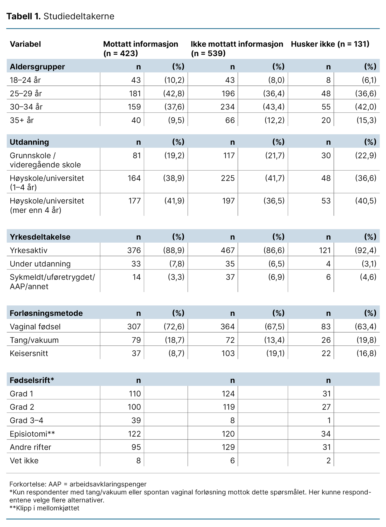 Totalt ble 1093 deltakere inkludert i studien, som både oppfylte inklusjonskriteriene og svarte på videre spørsmål. Tabell 1 viser karakteristika for utvalget i studien, fordelt på om de mottok informasjon om bekkenbunnstrening på barsel eller ikke.