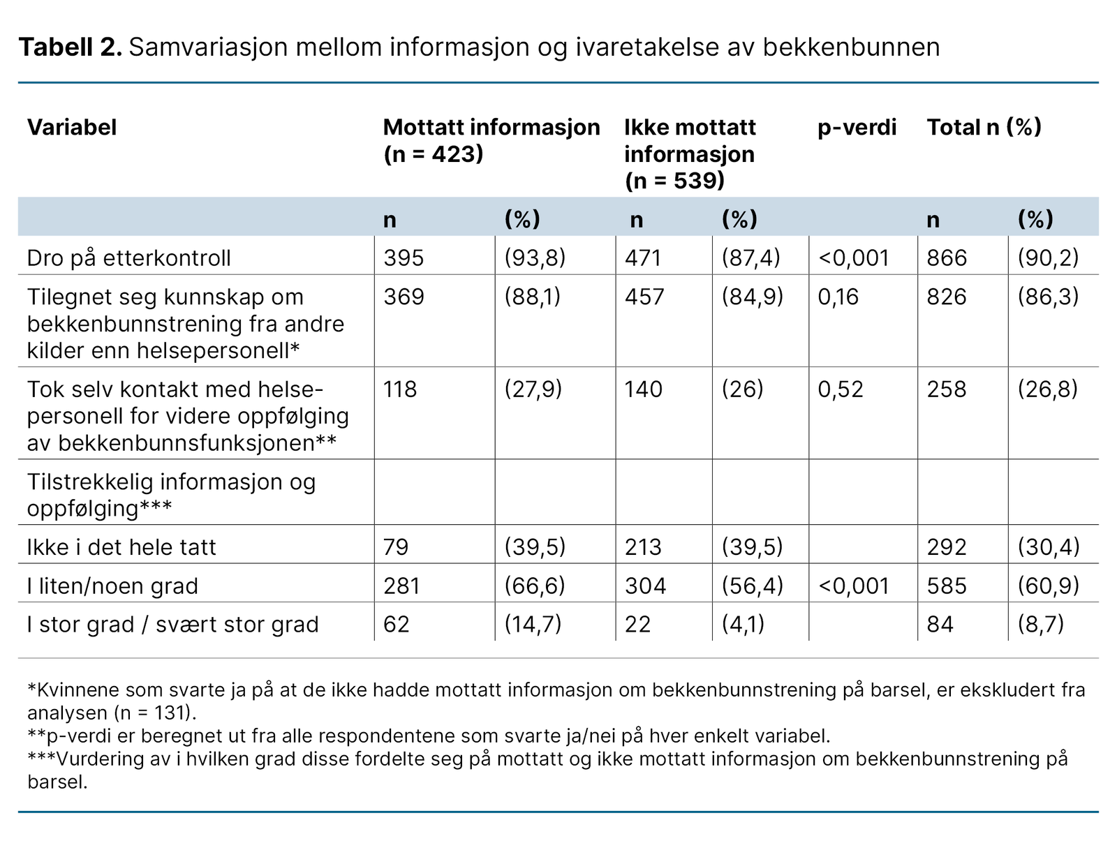 Det var en statistisk signifikant høyere andel kvinner som oppga at de mottok informasjon om bekkenbunnstrening på barsel av de som dro på etterkontroll (p-verdi < 0,001), sammenliknet med de som ikke mottok informasjon om bekkenbunnstrening på barsel.