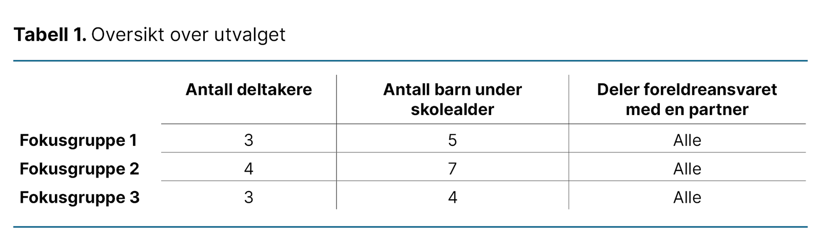 Inklusjonskriteriene for å delta var å ha minst ett barn under skolealder samt å kunne delta i en gruppesamtale på norsk. I alt ble ti deltakere rekruttert fordelt på tre fokusgrupper. Tre menn og sju kvinner deltok i studien. Alle hadde en partner de delte foreldreansvaret med, og majoriteten hadde to barn under skolealder i familien (tabell 1). Utvalget var homogent med tanke på sosioøkonomisk bakgrunn og etnisitet.
