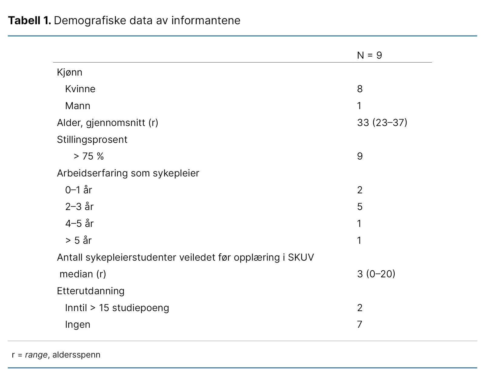 Ni sykepleiere fra to ulike avdelinger samtykket til å delta i studien. Fire sykepleiere takket nei – én på grunn av egen sykdom og de øvrige på grunn av arbeidspress i avdelingen. Inklusjonskriteriene var at deltakerne hadde gjennomført opplæring i SKUV-metoden og ansvar for å veilede sykepleierstudenter i praksis.