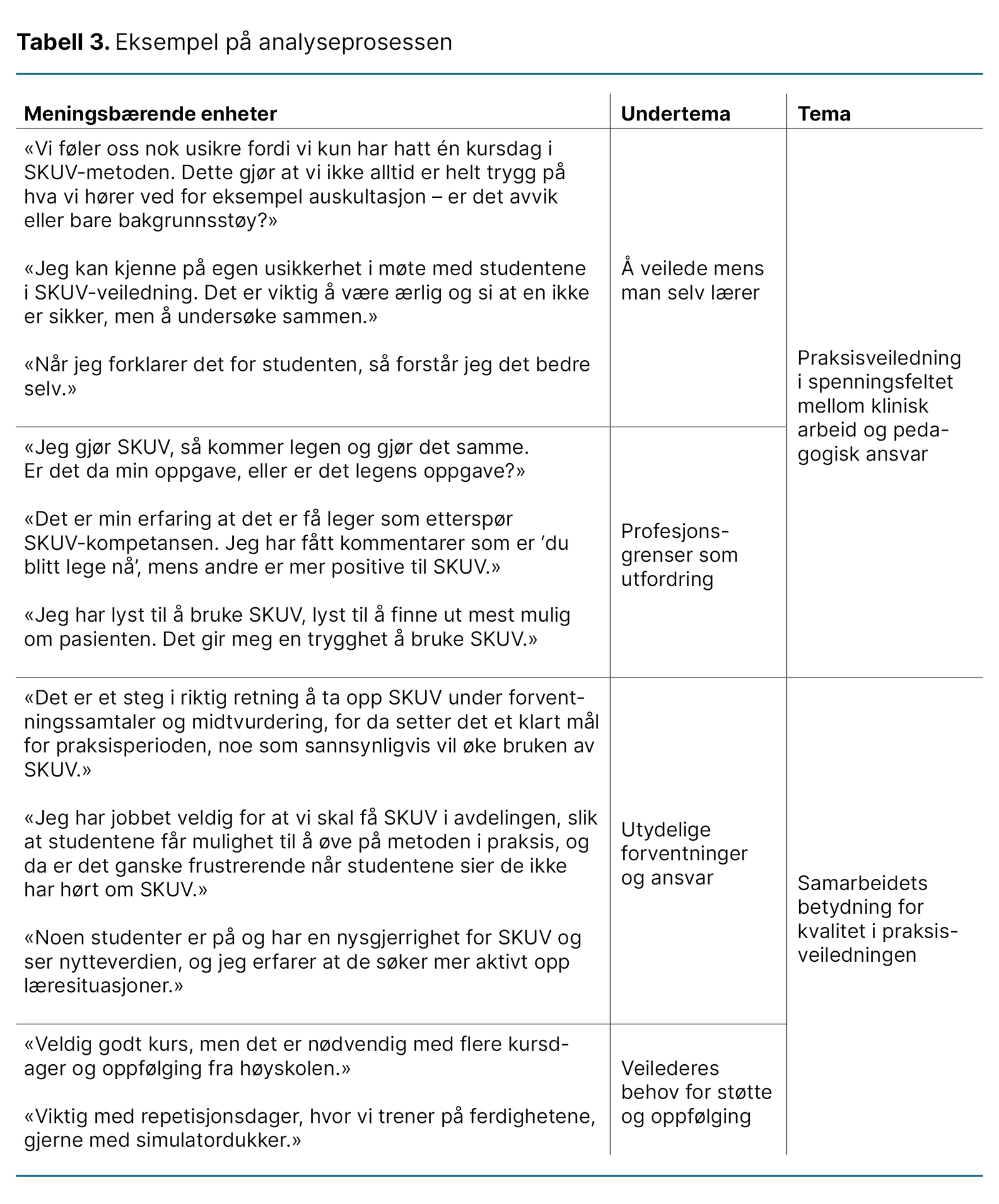 Informantene i studien hadde ulike erfaringer, noe som skapte et komplekst bilde av veiledning i SKUV og utfordringer med denne metoden. I analysen kom det frem to hovedtemaer: 1) «Praksisveiledning i spenningsfeltet mellom klinisk arbeid og pedagogisk ansvar» med følgende undertemaer: Å veilede mens man selv lærer, og Profesjonsgrenser som utfordring, og 2) «Samarbeidets betydning for kvalitet i praksisveiledningen» med undertemaene: Utydelige forventninger og ansvar, og Veilederes behov for støtte og oppfølging.