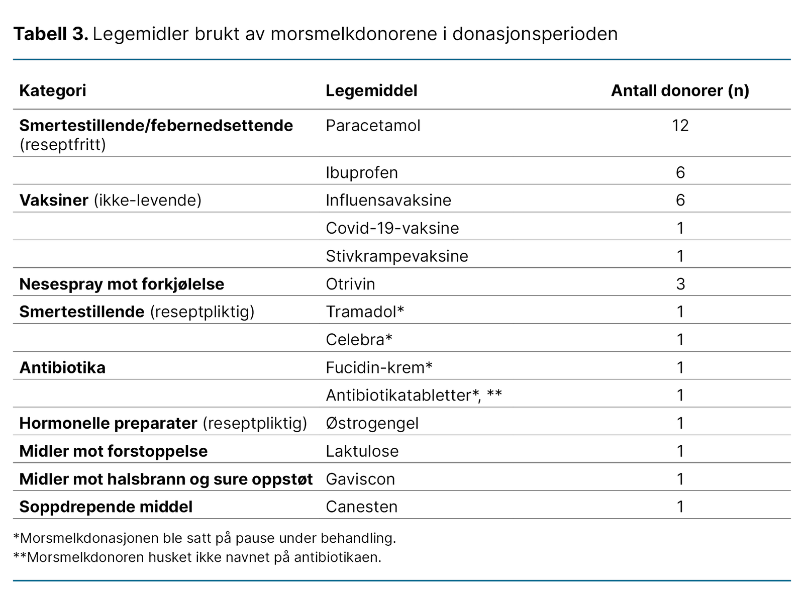 Flere av morsmelkdonorene hadde ulike helseplager i donasjonsperioden, som førte til sporadisk og behovsbasert bruk av legemidler. De mest brukte legemidlene var paracetamol, ibuprofen, vaksiner og slimavsvellende nesespray (tabell 3).