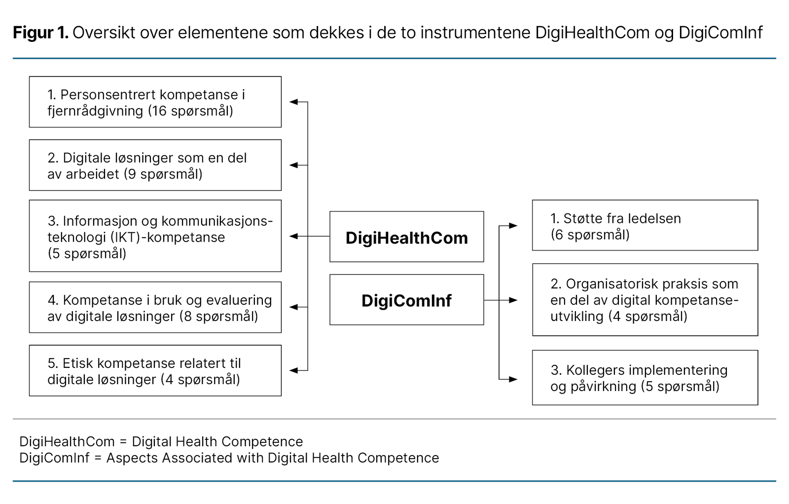 Instrumentet Digital Health Competence (DigiHealthCom) måler helsepersonells egenvurderte digitale helsekompetanse, mens Aspects Associated with Digital Health Competence (DigiComInf) kartlegger utdanningsmessige og organisatoriske rammer i helsetjenesten, som støtte fra ledelsen, opplæring, praksis for kompetanseutvikling og kollegial påvirkning (figur 1). Begge instrumentene har vist tilfredsstillende validitet og reliabilitet (15).