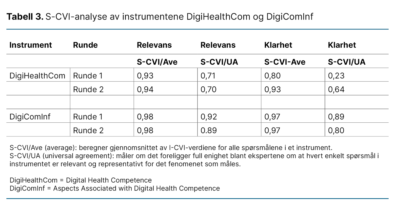 Innholdsvaliditet som helhet ble vurdert med S-CVI-analyse. Resultatene viser utviklingen i DigiHealthCom og DigiComInf mellom to ekspertrunder (tabell 3).