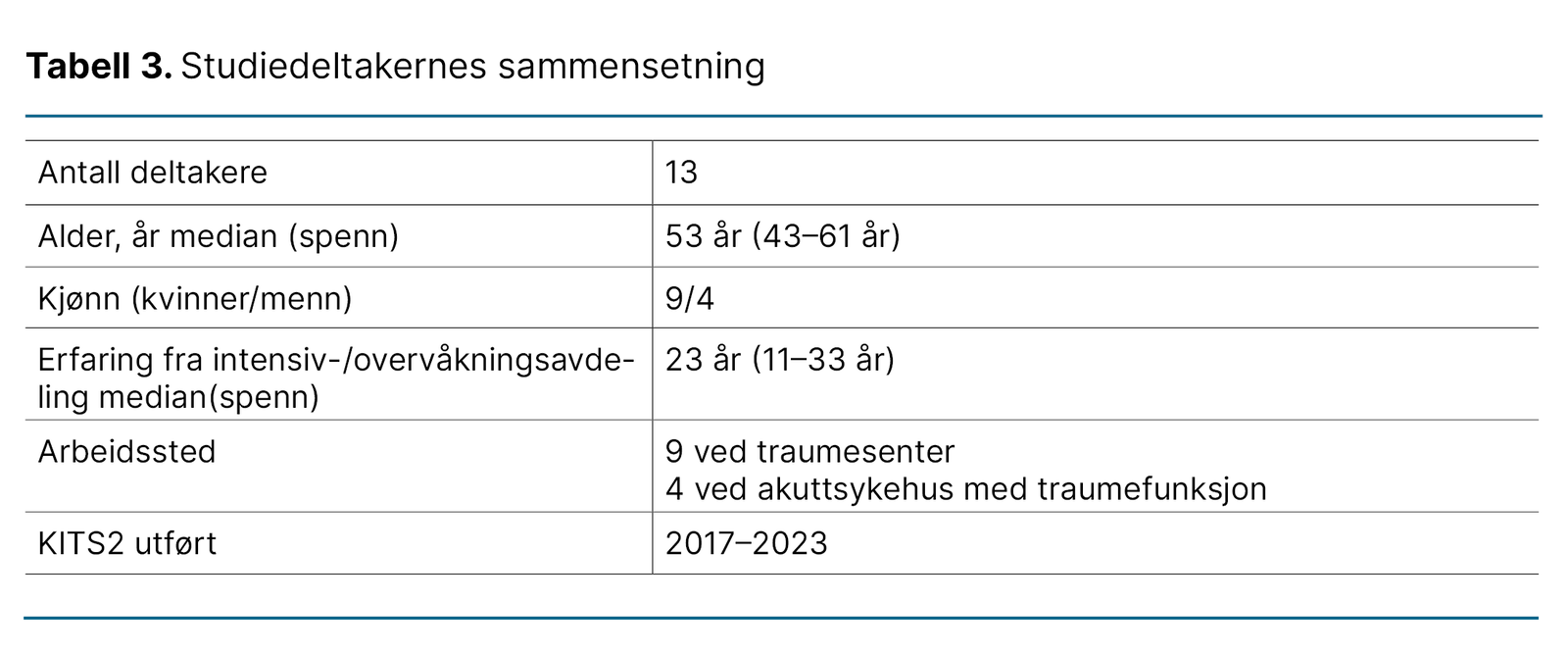Vi gjorde et strategisk utvalg med deltakere som best kunne besvare forskningsspørsmålet (18). Studiens inklusjonskriterier var intensivsykepleiere ved intensiv- og overvåkningsavdelinger som hadde gjennomført KITS2. Tabell 3 viser studiedeltakernes sammensetning.