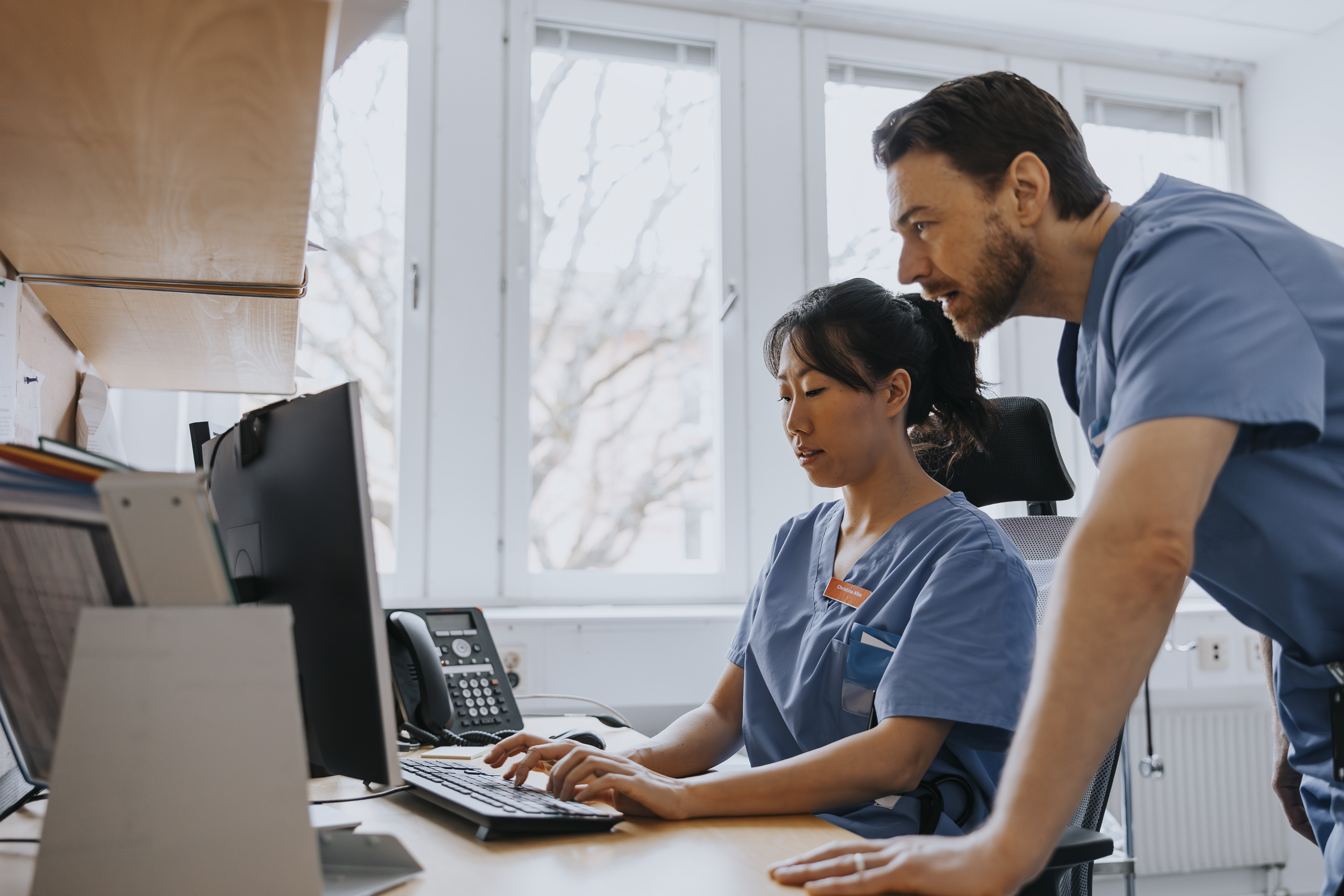 Bildet viser en kvinnelig sykepleier som sitter foran en PC. En mannlig sykepleier står bak henne og kikker på skjermen