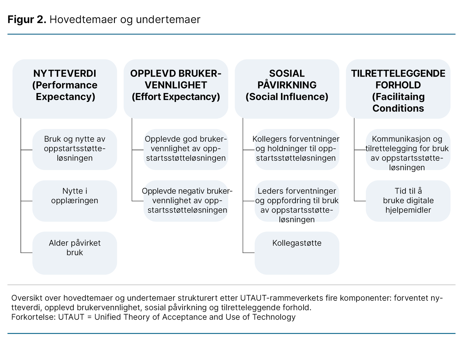 Analysen har de fire komponentene fra UTAUT som hovedtemaer, med tilhørende undertemaer (18) (figur 2).