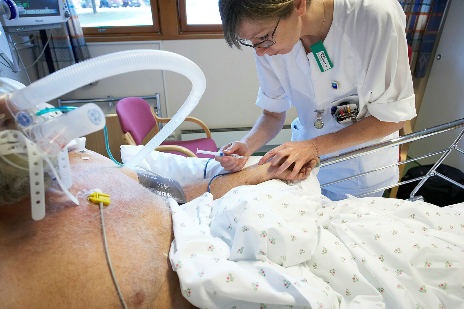 Sykepleier setter sprøyte på pasient, intensivavdelingen på Moss sykehus.
