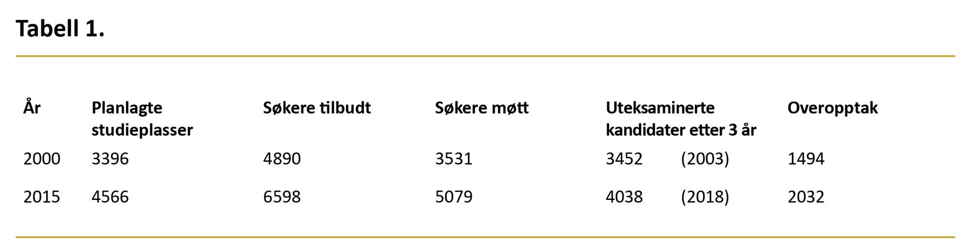 I tabellen under kan vi vise tydelig at opptak og uteksaminering ikke går hånd i hånd. NSF Student har pekt på lav kvalitet på praksis og overopptak som to av faktorene som er skyld i lavt antall uteksaminerte sykepleie sammenliknet med opptakstall.
