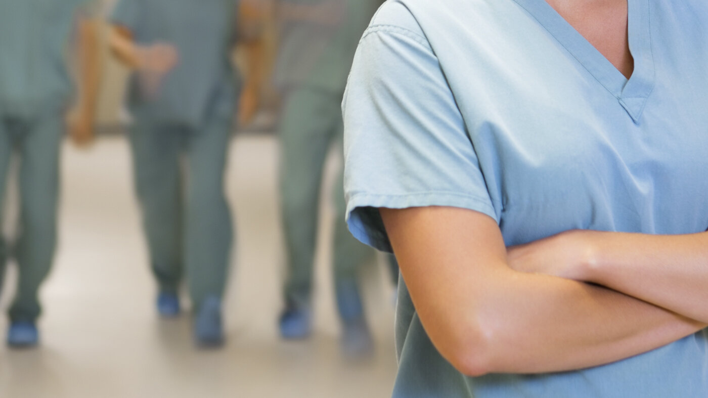 Bildet viser en sykepleier i forgrunnen med armene i kors