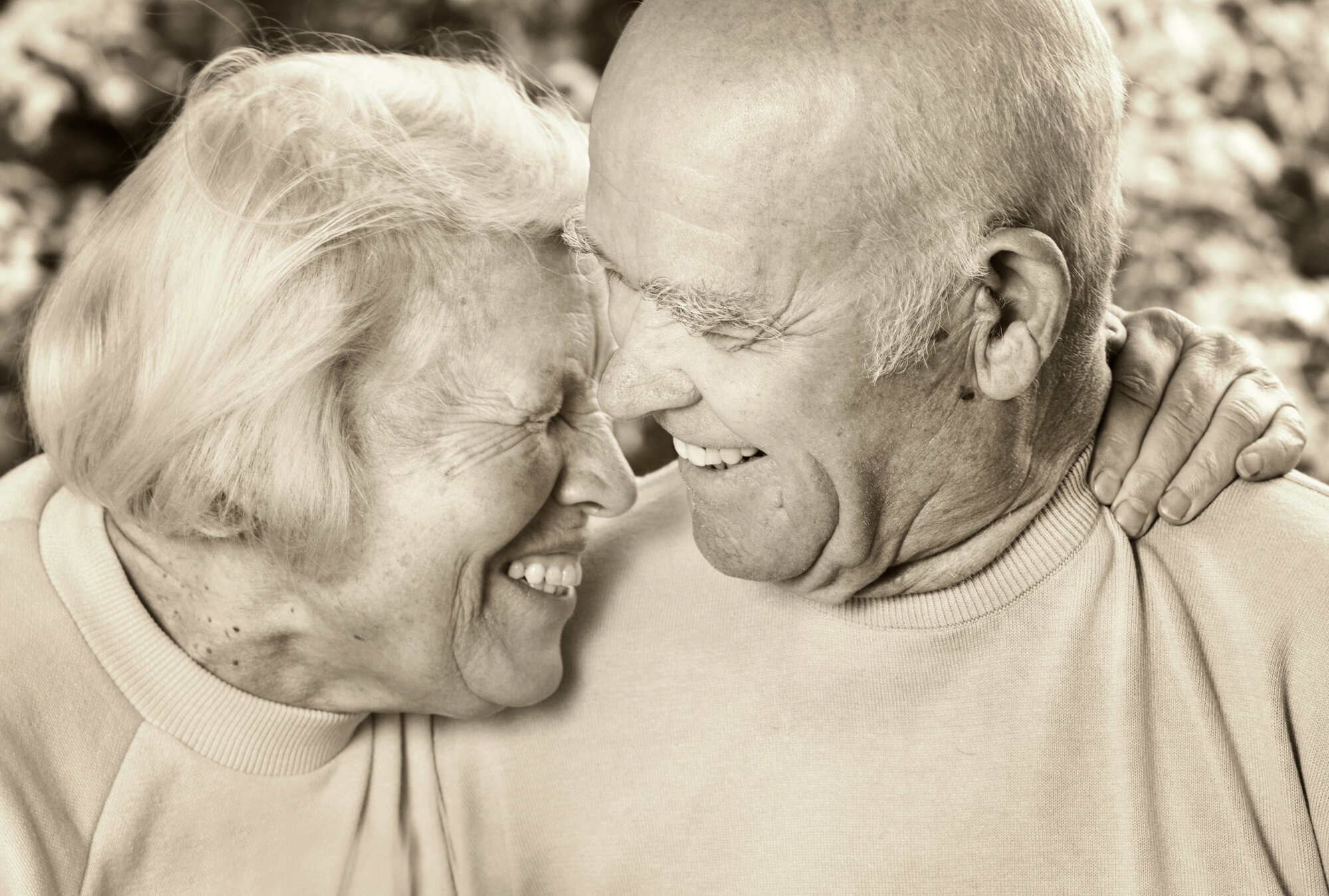 Bildet viser en eldre kvinne som holder rundt en eldre mann. De smiler.