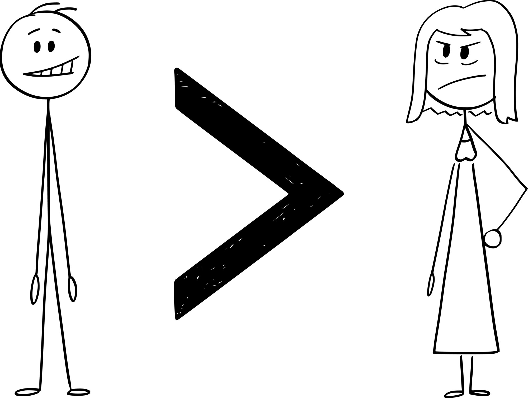 Bildet viser en tegning av en mann og en kvinne. Mellom dem er et større-enn-tegn som illustrerer at mannen er "større" enn kvinnen.