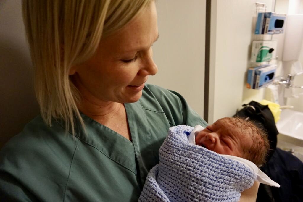 Fødselen som skjedde langs E6 mellom Kløfta og Skedsmokorset. Den planlagte hjemmefødselen som ble igangsatt på overtid på sykehus.