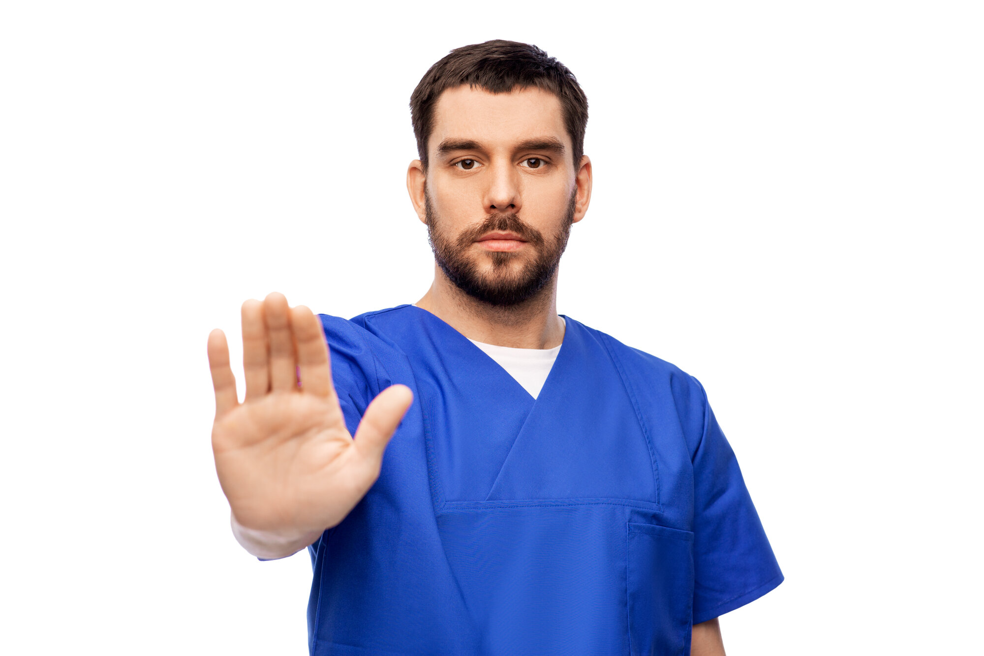 Bildet viser en mannlig sykepleier som viser håndflaten som et tegn på at nok er nok