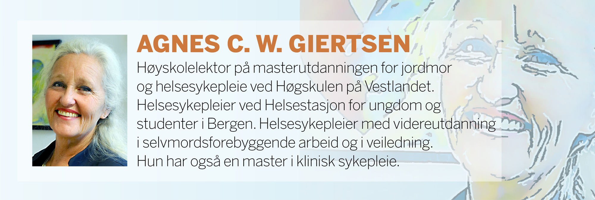 Som helsesykepleier har jeg nå i 24 år jobbet for og med ungdomshelse. Jeg har jobbet i videregående skole og jobber nå på helsestasjon for ungdom. Jeg underviser også kommende helsesykepleiere i, blant annet, ungdomshelse på Høgskolen på Vestlandet.