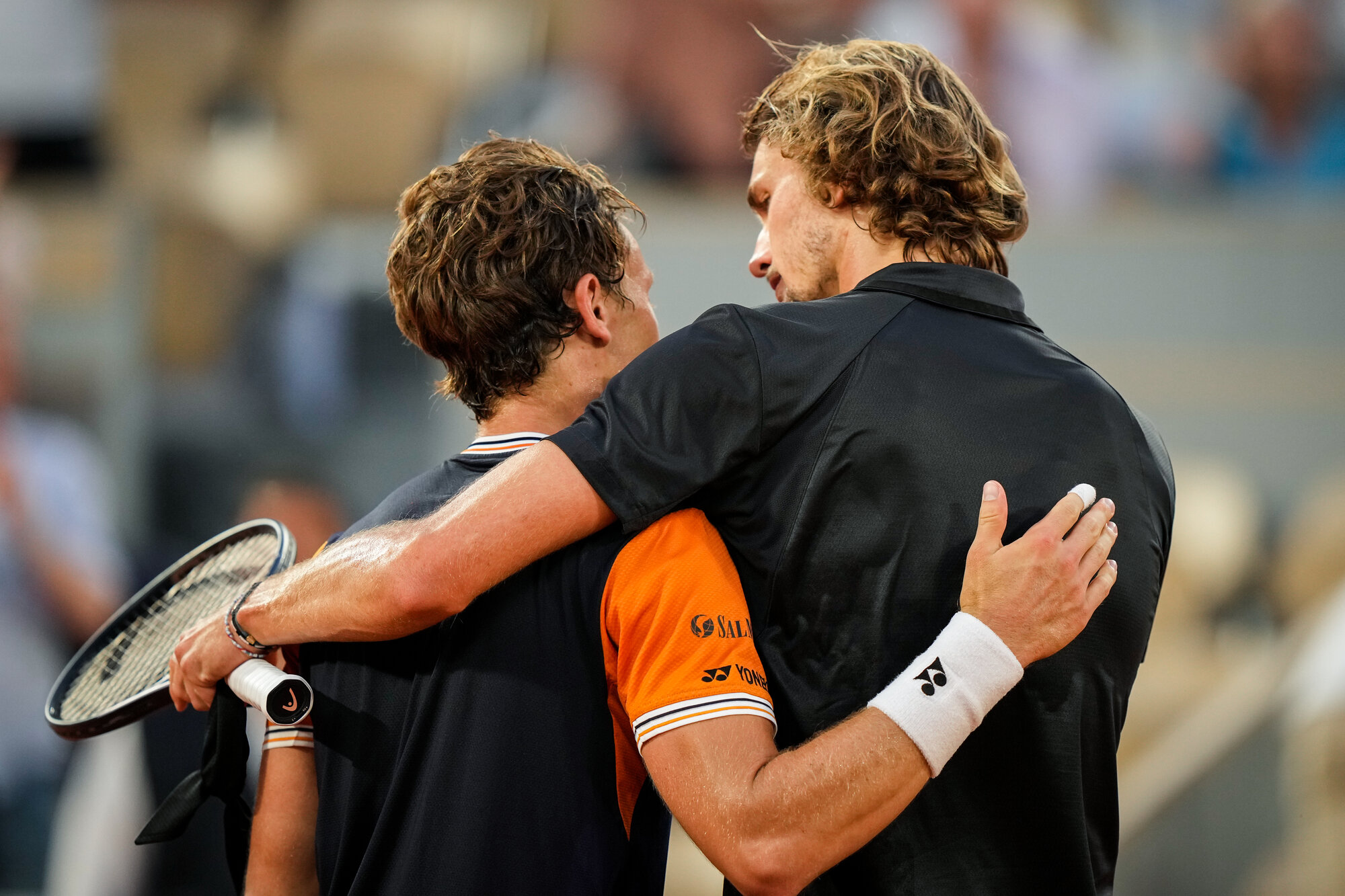 Bildet viser tennisspillerne Casper Ruud og Alexander Zverev. Zverev holder armen vennskapelig rundt Ruud etter French Open.