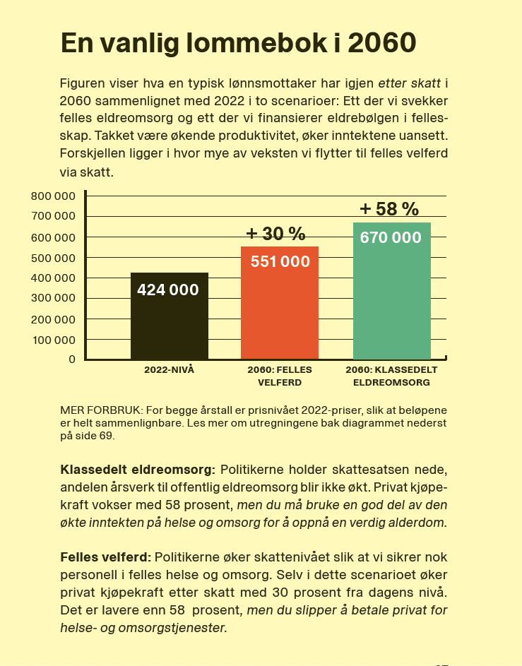 Hvis vi øker skattene så mye at vi får råd til alle de ekstra sykepleierne, legene, helsefagarbeiderne og andre fagfolk som trengs, blir veksten i kjøpekraft litt mindre. Men nordmenn vil fortsatt ha en økt kjøpekraft på 30 prosent, sammenliknet med i dag.