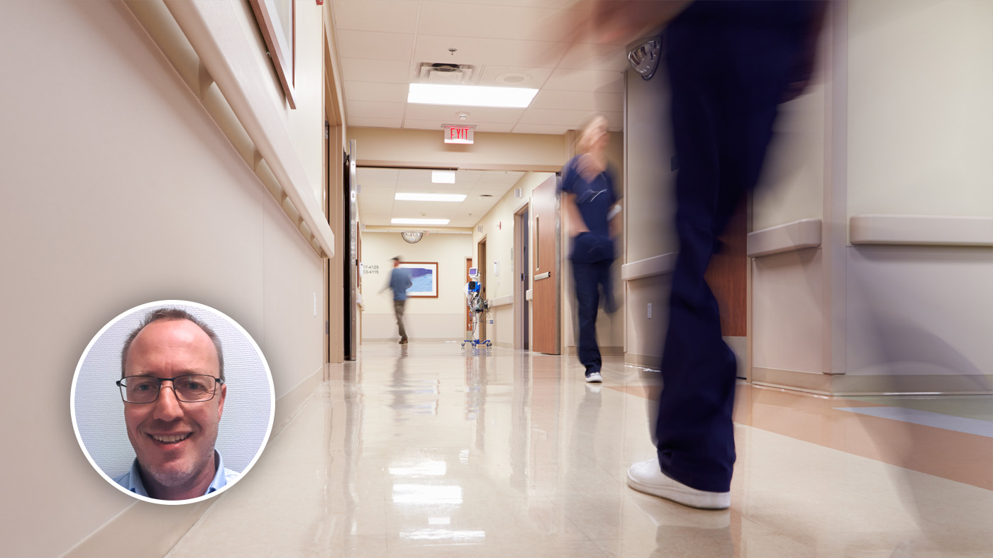 Bilder viser korridoren på et sykehus hvor mennesker løper forbi.