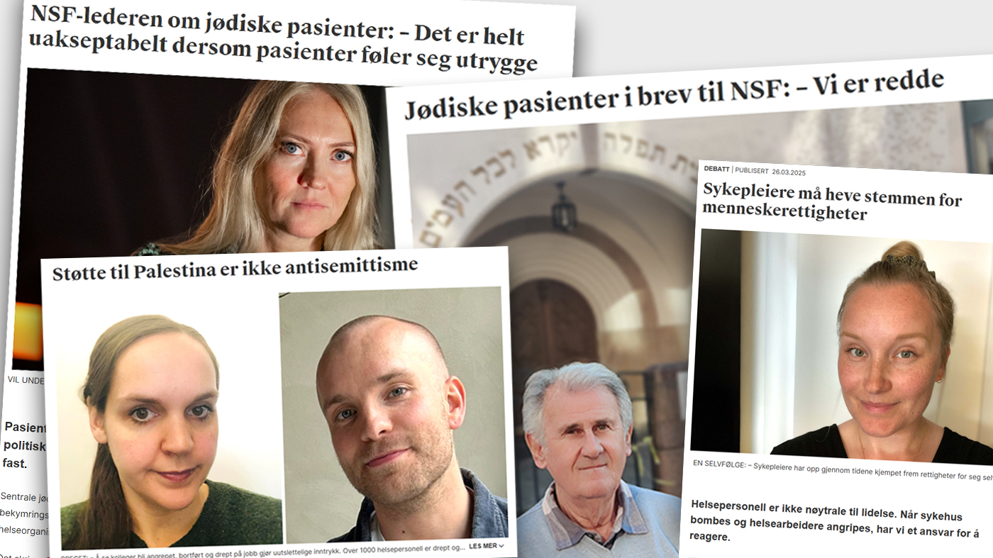 ,Etter 7. oktober 2023 var det en sykepleier som publiserte et bilde av sin overarm tatovert med Hamas samtidig som han uttrykte støtte til terroren 7 oktober. For meg som jøde, som vet hvilken bestialsk behandling sivile fikk 7 oktober av Hamas, er det uakseptabelt å få behandling av denne sykepleieren. Jeg ville vært livredd hvis jeg møtte på han i helsetjenesten. Innleggsforfatterne bagatelliserer våre bekymringer - vel, her mener jeg vi har et godt eksempel på en vel begrunnet bekymring jødiske pasienter har.
