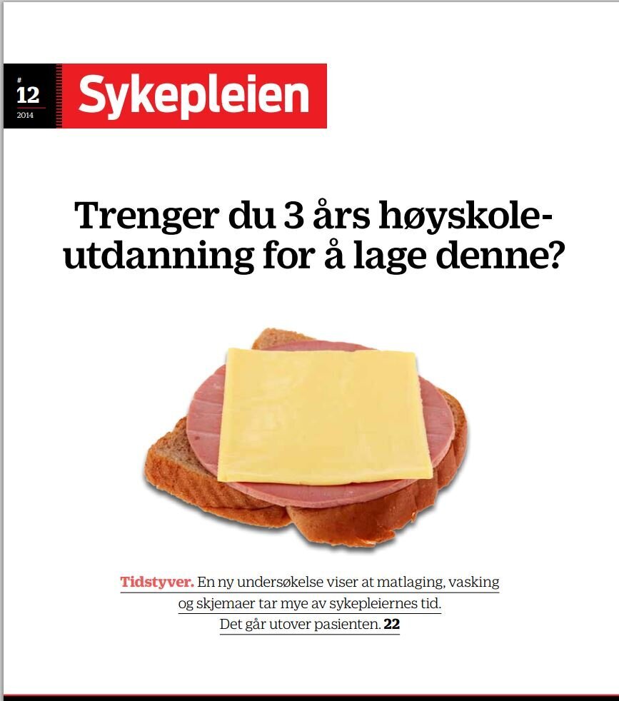 På forsiden av Sykepleien nr. 12/2014 står følgende: Trenger du 3 års høyskoleutdanning for å lage denne? Under teksten er det bilde av en brødskive med kjøttlignende pålegg og ost oppå. Etter å ha tatt inn over meg tekst og illustrasjoner fra side 22 til og med side 31 i samme tidsskrift, har jeg kommet frem til følgende svar: I denne sammenheng er 3 års høyskoleutdanning åpenbart ikke nok.