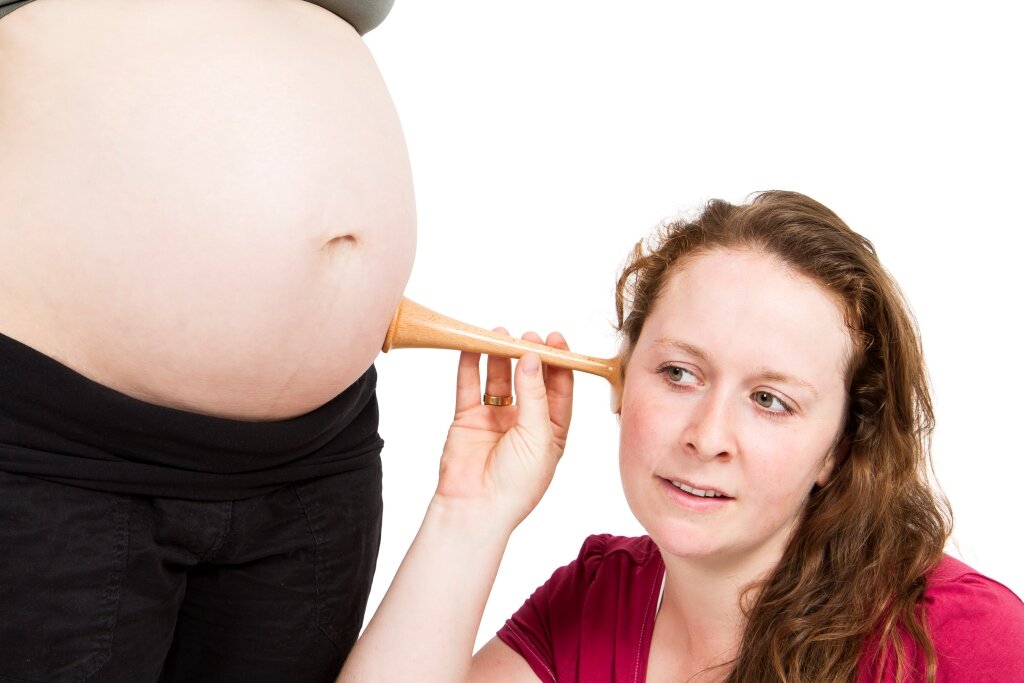 Bildet viser en jordmor som lytter på en mage med jordmorstetoskop.