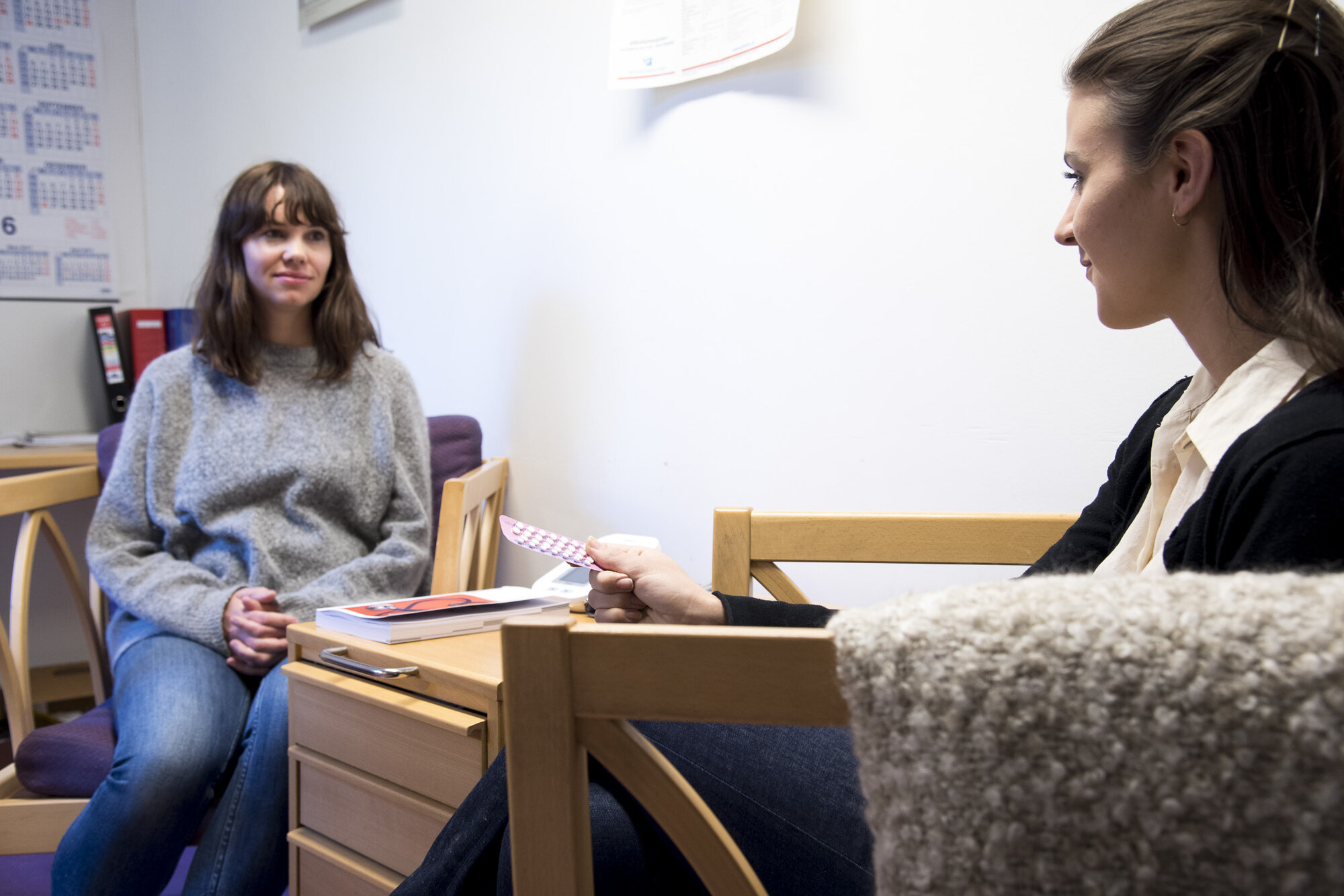 Bildet viser en ung jente som holder et p-pillebrett hos helsesøster.