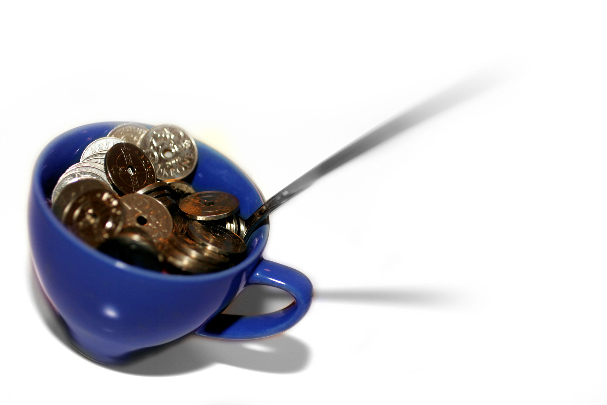 En blå kopp med kronestykker