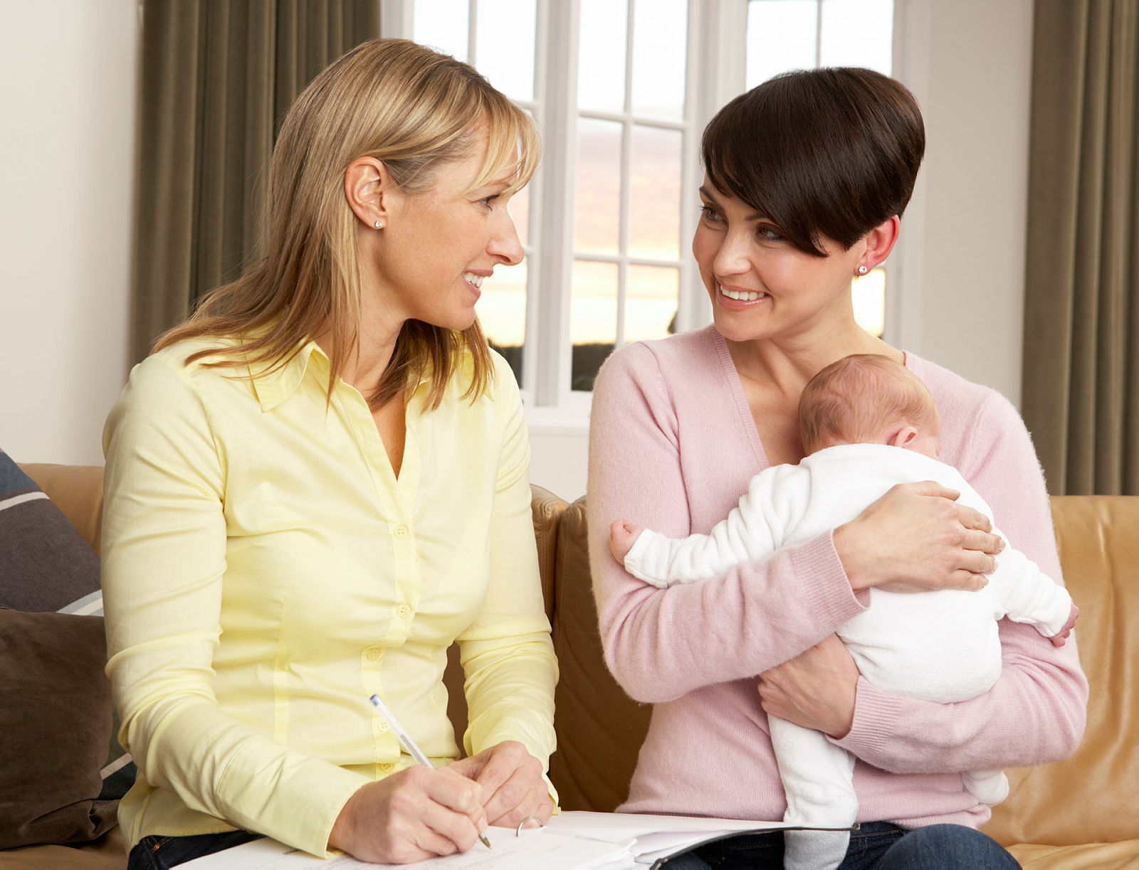 Bildet viser et hjemmebesøk, en helsesøster som besøker en mor og hennes nyfødte barn hjemme.