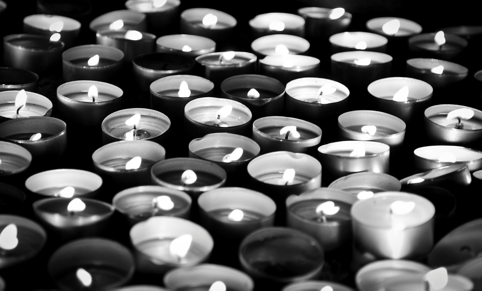 Bildet er svart-hvitt og viser mange telys som holder på å brenne ut