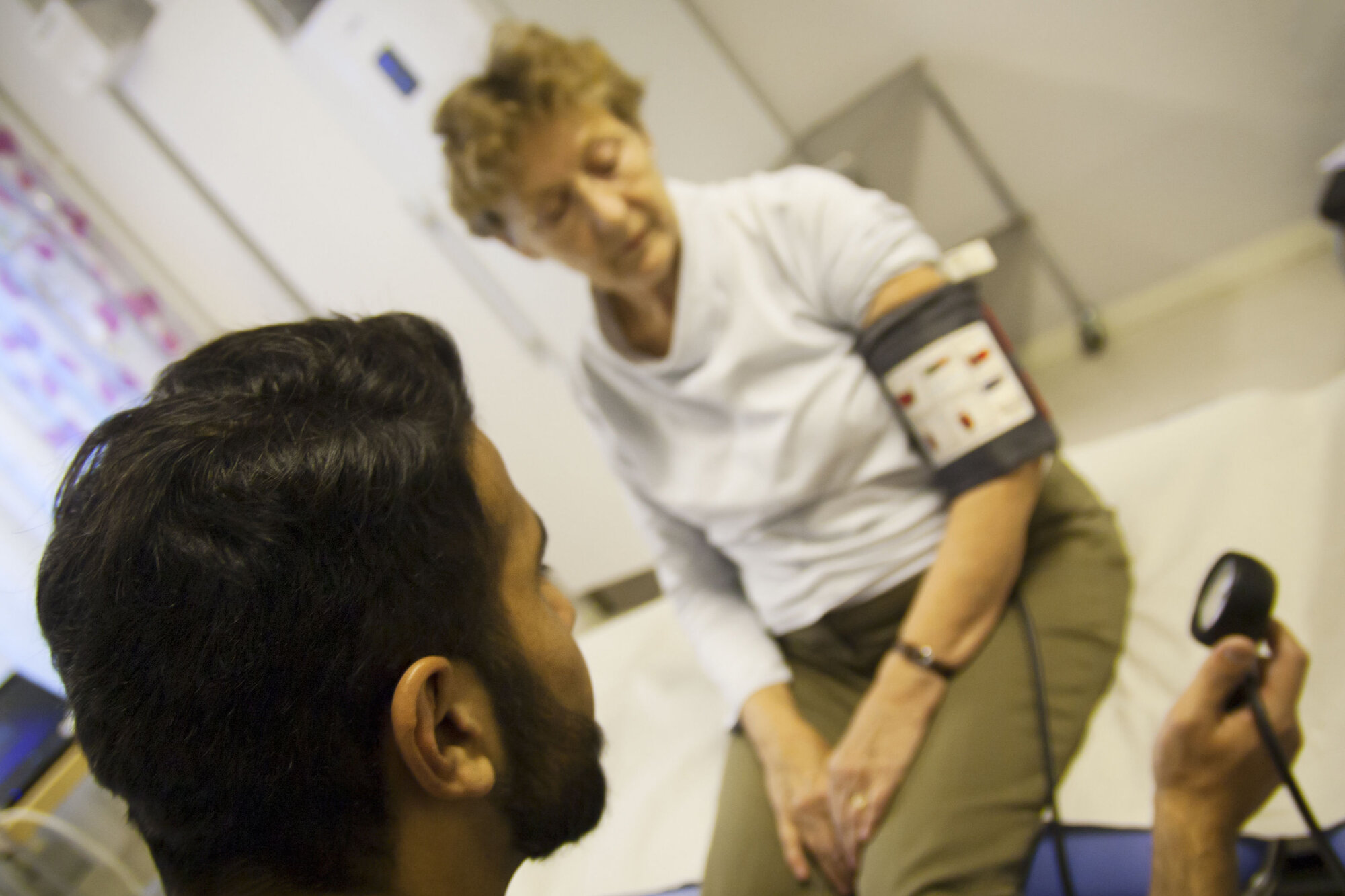 Mannlig sykepleier måler blodtrykket til eldre kvinne.