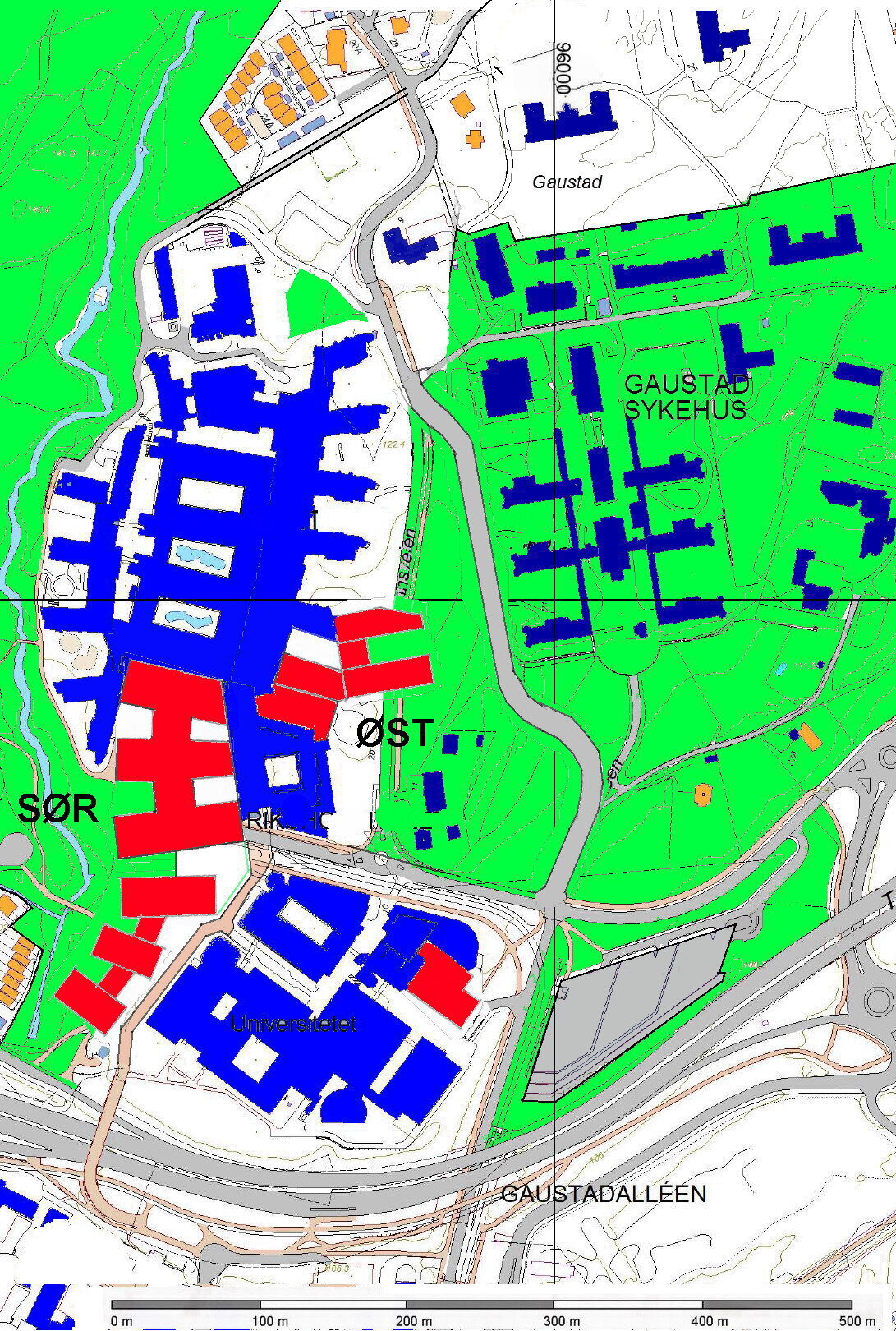 På Gaustad skal det bygges cirka 140 000 kvadratmeter i 16 etasjer, omtrent 70 meter, eller like høyt som rådhustårnene. Til sammenlikning er tillatt byggehøyde mot Gaustad sykehus i dag 12 meter. Videre skal det bygges i stor høyde også langs turveien ned mot Ringveien og i grøntområdet som er regulert til bevaring mellom Rikshospitalet og Gaustad sykehus (figur 2).
