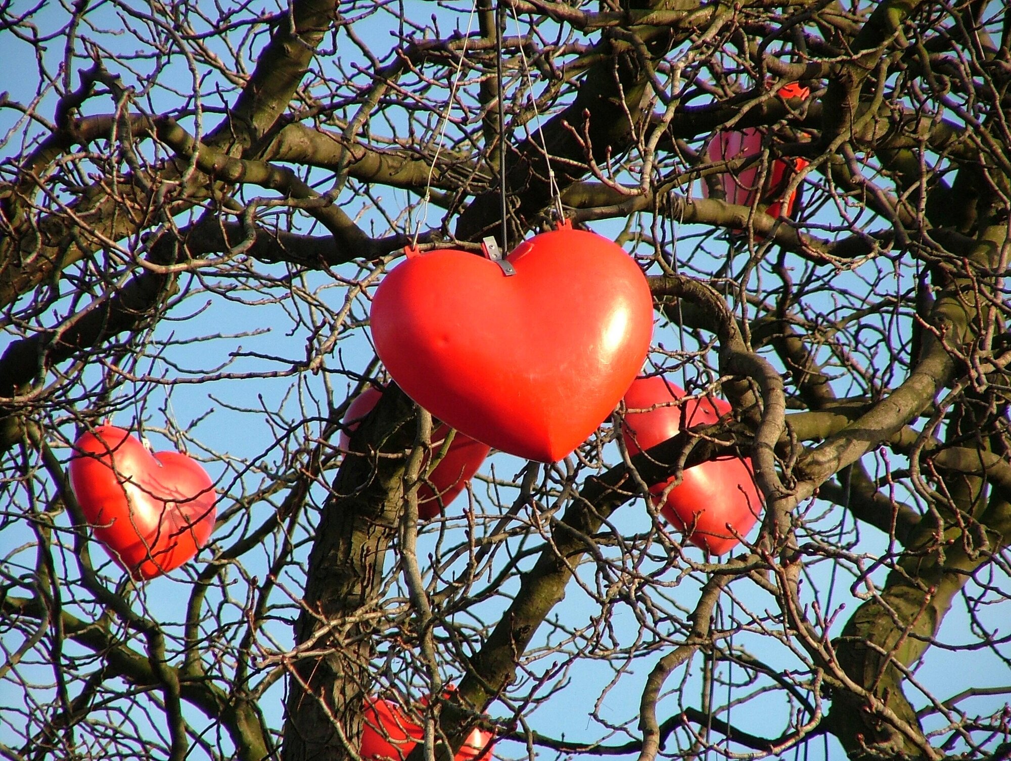 Røde hjerter som henger på et nakent tre