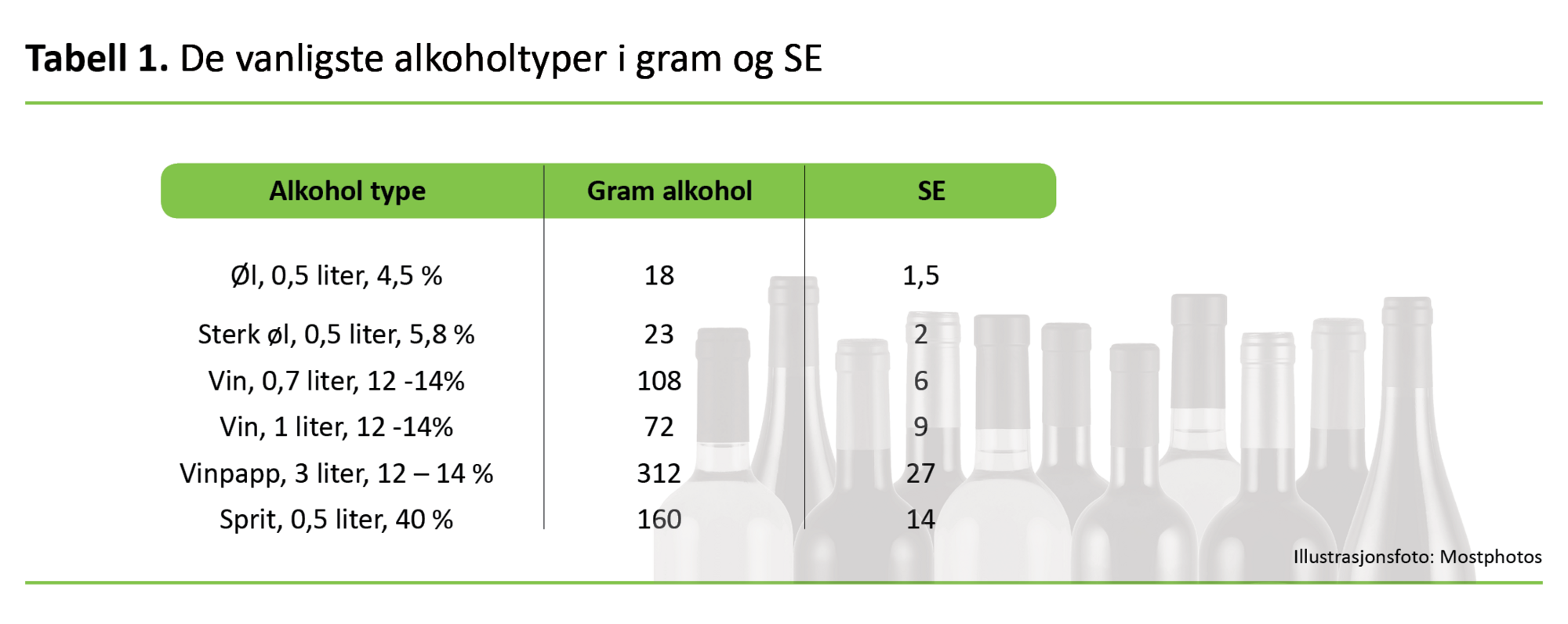Jeg opplever stor forvirring knyttet til hva som er en standard alkoholenhet (SE). I Norge er det SE 12 gram alkohol. Kjennskap til hva som er en SE er viktig for å få en presis AUDIT-skår. Tabellen 1 er regnet ut etter følgende formel: (Alkohols egenvekt (0,8) x alkoholprosent) x DL) /SE (3).