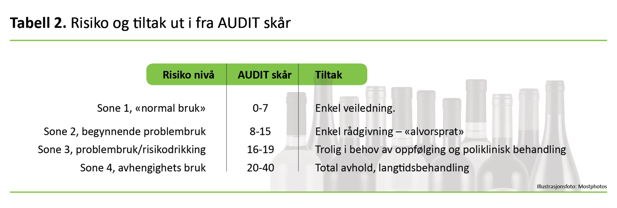 Tabellen under er hentet fra AUDIT-manualen (4). Den er oversatt og noe bearbeidet av meg.