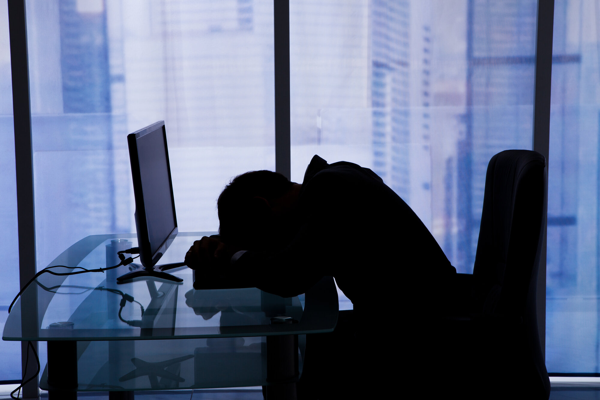 Bildet viser silhuett av en mann som ligger med hodet i armene foran pc-en